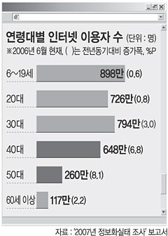 PCº¸´Ù ŸÀڱ⸦ ¸ÕÀú ÀÍÈù 50´ë°¡ ³×ƼÁð ´ë¿­¿¡ °¡¼¼Çϰí ÀÖ´Â Ãß¼¼°¡ ¶Ñ·ÇÇØÁö°í ÀÖ´Ù. ½ÇÁ¦·Î 50´ë °¡¿îµ¥ µÎ ¸í Áß ÇÑ ¸íÀÌ ÀÎÅͳÝÀ» »ç¿ëÇÒ ³¯µµ ¸ÖÁö ¾Ê¾Ò´Ù. 7ÀÏ Á¤º¸Åë½ÅºÎ¿Í Çѱ¹ÀÎÅͳÝÁøÈï¿øÀÇ ¡®2007³â »ó¹Ý±â Á¤º¸È­½ÇÅÂÁ¶»ç¡¯ °á°ú¿¡ µû¸£¸é 50´ëÀÇ ÀÎÅÍ³Ý ÀÌ¿ë·üÀº Áö³­ÇØ 6¿ù(37.5%)º¸´Ù 8.1%Æ÷ÀÎÆ® ´Ã¾î³­ 45.6%¸¦ ±â·ÏÇØ ´Ù¸¥ ¿¬·É´ë¿¡ ºñÇØ °¡Àå ³ôÀº Áõ°¡¼¼¸¦ ±â·ÏÇß´Ù. 40´ë´Â 6.8%Æ÷ÀÎÆ® ¿À¸¥ 77.8%, 30´ë´Â 3%Æ÷ÀÎÆ® ¿À¸¥ 94.6%·Î ÀÎÅÍ³Ý ÀÌ¿ë·ü Áõ°¡¼¼¿¡¼­ µÚ¸¦ À̾ú´Ù.