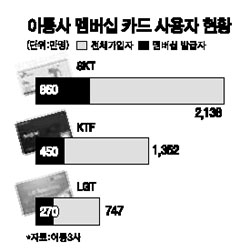 9ÀÏ °ü·Ã¾÷°è¿¡ µû¸£¸é SKÅÚ·¹ÄÞ, KTF, LGÅÚ·¹ÄÞ µî ÀÌÅë3»ç Àüü°¡ÀÔÀÚ 4,250¸¸¸í Áß ¸â¹ö½Ê Ä«µå¸¦ ¹ß±Þ ¹ÞÀº »ç¿ëÀÚ´Â 1,580¸¸¸íÀ¸·Î 37%¸¸ÀÌ ¸â¹ö½Ê ÇýÅÃÀ» »ç¿ëÇϰí ÀÖ´Ù. SKT´Â 2,138¸¸¸í Áß 40%(860¸¸¸í), KTF´Â 1,352¸¸ °¡ÀÔÀÚ Áß 33%(450¸¸¸í), LGT´Â 747¸¸¸í Áß 36%(270¸¸¸í)¸¸ÀÌ ¸â¹ö½Ê Ä«µå¸¦ ¹ß±Þ¹ÞÀº °ÍÀ¸·Î Á¶»çµÆ´Ù.
