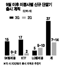 3¼¼´ë(3G) À̵¿Åë½Å ¼ºñ½º°¡ ºü¸£°Ô È®»êµÇ¸é¼ ±âÁ¸ÀÇ 2G ´Ü¸»±â º¸±ÞÀÌ ±Þ¼ÓÈ÷ ÁÙ¾îµé°í ÀÖ´Ù. ƯÈ÷ KTF¿¡ À̾î SKÅÚ·¹ÄÞÀÌ 9¿ù ÀÌÈÄ 3G ´Ü¸»±â Ãâ½Ã¿¡ ÁÖ·ÂÇϰí LGÅÚ·¹ÄÞµµ ³»³âºÎÅÍ ¸®ºñÀü(r)A ¼ºñ½º¿¡ ¿ÃÀÎÇÑ´Ù´Â Àü·«À» ¼¼¿ì¸é¼ ¾ÕÀ¸·Î 2G ´Ü¸»±â º¸±â°¡ ´õ¿í Èûµé¾îÁú Àü¸ÁÀÌ´Ù.