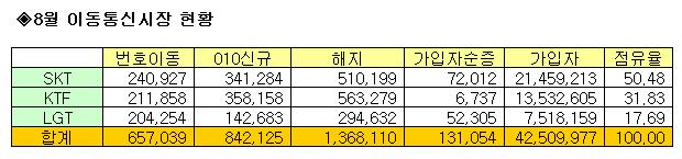 ¾÷üº°·Î´Â SKÅÚ·¹ÄÞÀÇ °æ¿ì 8¿ù Áß °¡ÀÔÀÚ°¡ 7¸¸2012¸í ¼øÁõÇØ 2145¸¸9213¸íÀÇ ´©Àû °¡ÀÔÀÚ¸¦ ±â·ÏÇß´Ù. ½Å±Ô °¡ÀÔÀÚ´Â ¹øÈ£À̵¿ 24¸¸927¸í, 010 ½Å±Ô 34¸¸1284¸í µî ÃÑ58¸¸2211¸íÀ̾úÀ¸¸ç ÇØÁöÀÚ´Â 59¸¸9809¸íÀ̾ú´Ù.