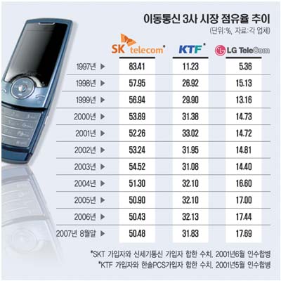 ÀÌÅë¾÷üµéÀº ÀÌÁ¦´Â Áö»óÆÄ DMB ½Ãû°ú ¸ð¹ÙÀÏ ¹ðÅ· ¼­ºñ½º¿¡ À̸£±â±îÁö ÈÞ´ëÀüÈ­ Çϳª·Î ¼¼»ó°ú ÅëÇÏ´Â ½Ã´ë¸¦ ÇâÇØ ´Þ·Á°¡°í ÀÖ´Ù. ÀÌ °°Àº ±â¼ú·ÂÀÇ ¹ßÀü À̸鿡 PCS 3»çÀÇ ¡®°ø¡¯(Íí)ÀÌ ÀÖ¾úÀ½À» ºÎÀÎÇÏ±â ¾î·Æ´Ù. Áö³­ 10³â°£ Àüü À̵¿Åë½Å °¡ÀÔÀÚ¼ö´Â 97³â ¸»¿¡ 682¸¸¸í¿¡¼­ 98³â ¸»¿¡´Â 1398¸¸¸í, 99³â 2344¸¸¸í, 2002³â 3234¸¸¸íÀ¸·Î ²ÙÁØÈ÷ ´Ã¾î³µ´Ù. 2006³â¿¡´Â 4000¸¸¸íÀ» ³Ñ¾î¼¹°í, 2007³â 8¿ù ¸» ÇöÀç 4250¸¸¸í¿¡ À̸¥´Ù. pcs °¡ÀÔÀÚ¸¸ 8¿ù¸» ÇöÀç 2100¸¶¸íÀÌ´Ù. 97³â ¸» 15% ¼öÁØÀÌ´ø ±¹³» ÈÞ´ëÀüÈ­ º¸±Þ·üµµ ¿Ã 8¿ù ¸» ÇöÀç 86%·Î ¿Ã¶ó¼¹´Ù. ¾÷ü°£ ½ÃÀå Á¡À¯À²Àº SKÅÚ·¹ÄÞÀÌ 50.5%·Î ¼±µÎ¸¦ ´Þ¸®°í ÀÖ°í, KTF°¡ 31.8%, LGÅÚ·¹ÄÞÀÌ 17.7% ¼øÀÌ´Ù.