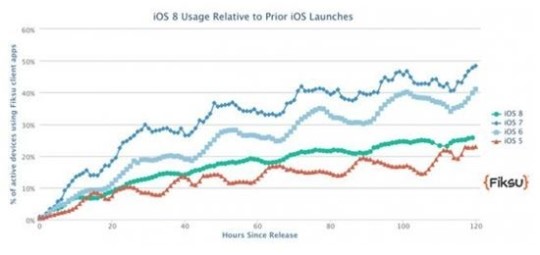 ÀÌ ¼öÄ¡´Â Áö³­ÁÖ ¹ßÇ¥µÈ Ãʱâ iOS8 ä¿ë·ü 15%¿¡ ºñÇØ °ÅÀÇ ¹è°¡ »ó½ÂÇÑ °ÍÀÌ´Ù. ÇÏÁö¸¸ ÀÛ³â iOS7ÀÇ ¹èÆ÷ ÈÄ °°Àº ±â°£ µ¿¾ÈÀÇ Ã¤¿ë·ü 50%º¸´Ù´Â Å©°Ô ³·Àº °ÍÀÌ´Ù. ¾ÖÇÃÀº ¾ÆÁ÷ iOS8 ä¿ë·üÀ» °ø½ÄÀûÀ¸·Î ¹ßÇ¥ÇÏÁö ¾Ê¾Ò´Ù.