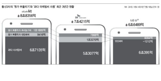 Åë½Å ÀÌ¿ëÀÚ ºÎ´ãÀ» °áÁ¤ÀûÀ¸·Î ³ôÀÎ °ÍÀº °ú´ÙÇÑ ´Ü¸»±â Áö¿øº¸Á¶±Ý µî ´Ã ¹®Á¦°¡ µÆ´ø ¸¶ÄÉÆÃ ºñ¿ëÀ¸·Î, ÀڽŵéÀÌ Á¤ÇÑ °¡À̵å¶óÀκ¸´Ù 18Á¶¿øÀ» ´õ ÁöÃâÇß´Ù°í °¨»ç¿øÀº Æò°¡Çß´Ù. ¾Õ¼­ 2010³â Åë½Å 3»ç´Â ´Ü¸»±â º¸Á¶±Ý°ú °¡ÀÔÀÚ À¯Ä¡¿Í À¯Áö¸¦ À§ÇØ ´ë¸®Á¡¿¡ Áö±ÞÇÏ´Â Áö±Þ¼ö¼ö·á µî ¸¶ÄÉÆÃºñÀÇ Çѵµ¸¦ ¸ÅÃâ¾× ´ëºñ 22%, 2011³âºÎÅÍ 20%·Î ³·Ãß±â·Î ÇÏ´Â ¡®¸¶ÄÉÆÃºñ °¡À̵å¶óÀΡ¯¿¡ ¹æ¼ÛÅë½ÅÀ§¿øÈ¸¿Í ÇÔ²² ÇÕÀÇÇß´Ù. ±×·¯³ª À̹ø °¨»ç¿¡¼­ ¾Ë ¼ö ÀÖµí ÀÌ ¾à¼ÓÀº ÁöÄÑÁöÁö ¾Ê¾Ò´Ù. À̸¦ °ü¸®ÇØ¾ß ÇÒ ¹Ì·¡ºÎ¿Í ¹æÅëÀ§´Â °³ÀÔÇÏÁö ¾Ê¾Ò´Ù. ÀÌ ±Ý¾×Àº ±×´ë·Î ¿ø°¡¿¡ ¹Ý¿µµÅ Åë½Å¿ä±ÝÀ¸·Î Àü°¡µÆ´Ù. °á±¹ ´Ü¸»±â¸¦ ÀÚÁÖ ¹Ù²Ù´Â »ç¶÷ÀÇ ´Ü¸»±â Áö¿ø±ÝÀ» ´Ü¸»±â¸¦ ¹Ù²ÙÁö ¾Ê´Â ¼ÒºñÀڵ鵵 ¹°°í ÀÖ´Â ¼ÀÀÌ´Ù.