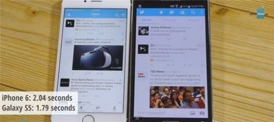 28ÀÏ(ÇöÁö½Ã°£) Á¤º¸±â¼ú(IT)Àü¹®¸Åü Æù¾Æ·¹³ª´Â ½ÇÁ¦ »ýȰ¿¡¼­ µÎ ±â±âÀÇ ¼Óµµ Â÷À̰¡ ¾ó¸¶³ª ³ª´ÂÁö ½ÇÇèÇÏ´Â ¿µ»óÀ» À¯Æ©ºê¿¡ °ÔÀçÇß´Ù. ½ÇÇè¿¡ »ç¿ëµÈ ¾ÆÀÌÆù6´Â iOS 8, °¶·°½ÃS5´Â ¾Èµå·ÎÀ̵å 4.4.2ÀÌ Àû¿ëµÆÀ¸¸ç °°Àº ¿ÍÀÌÆÄÀ̸Á¿¡ Á¢¼ÓÇØ µ¿ÀÏÇÑ ¾ÖÇø®ÄÉÀ̼Ç(¾Û)À» ±¸µ¿ÇÏ´Â ½ÄÀ¸·Î ÁøÇàµÆ´Ù.