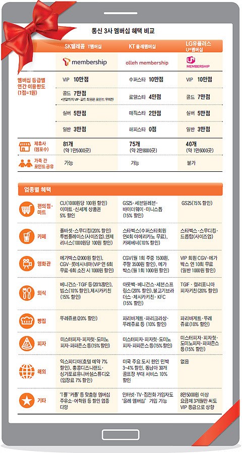 Åë½Å 3»ç ¸â¹ö½ÊÀ» µ·À¸·Î Á÷Á¢ ºñ±³ÇÏ´Â °Ç Èûµé´Ù. 3»ç°¡ ¿î¿µÇÏ´Â ¸â¹ö½Ê Á¦µµÀÇ Àüü Ʋ°ú Æ÷ÀÎÆ® Áö±Þ¾×ÀÌ °ÅÀÇ ºñ½ÁÇϰí, Åë½Å»çº°·Î Á¦ÈÞµÈ ¾÷ü¿Í ÇÒÀÎÀ²ÀÌ ¸ðµÎ ´Ù¸£±â ¶§¹®ÀÌ´Ù. 3»ç´Â Àü³âµµ ¿ä±Ý ³³ºÎ¾×°ú °¡ÀÔ ±â°£ µî¿¡ µû¶ó ȸ¿ø µî±ÞÀ» 4°³·Î ³ª´²¼ Æ÷ÀÎÆ®¸¦ Â÷µî Áö±ÞÇÑ´Ù. SKÅÚ·¹ÄÞ¡¤LGÀ¯Ç÷¯½º´Â µî±Þº°·Î Æ÷ÀÎÆ® 10¸¸¡¤7¸¸¡¤5¸¸¡¤3¸¸Á¡À» Áö±ÞÇÑ´Ù. KT´Â 10¸¸¡¤4¸¸¡¤2¸¸Á¡À» Áö±ÞÇÏ°í °¡Àå ³·Àº µî±Þ ȸ¿ø¿¡°Ô´Â Æ÷ÀÎÆ®¸¦ ÁÖÁö ¾Ê´Â´Ù. ´ë½Å KTÀÇ ÀÎÅͳݡ¤TV¡¤Áý Àüȸ¦ ¾µ °æ¿ì ÀÌ ¿ä±Ýµé±îÁö µî±Þ »êÁ¤ ±âÁØ¿¡ Æ÷ÇÔÇÒ ¼ö ÀÖ¾î¼ ¿ì¼ö ȸ¿øÀÌ µÇ´Â °ÍÀÌ ½¬¿î ÆíÀÌ´Ù.