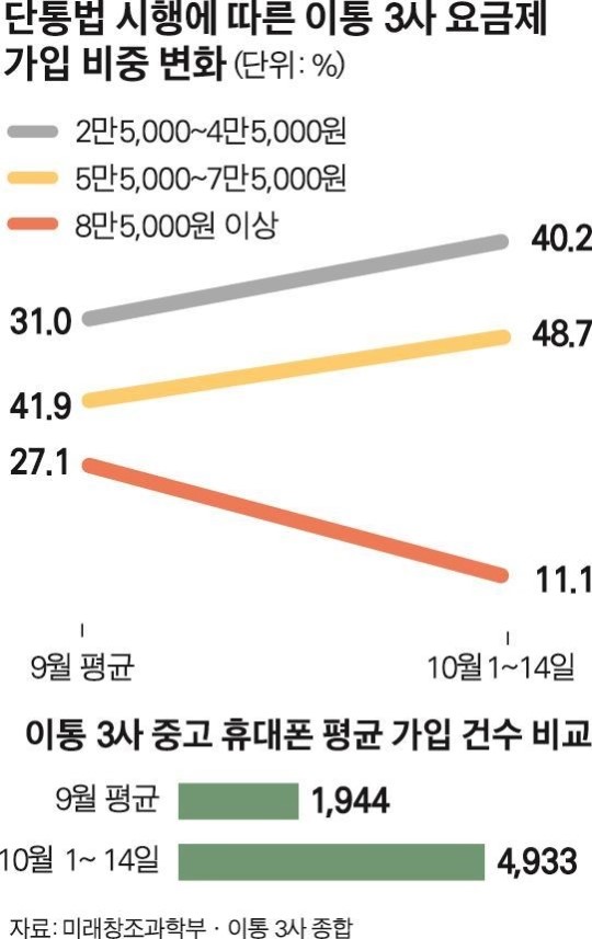 ´ÜÅë¹ý ½ÃÇà ÀÌÈÄÀÎ 1~14ÀϱîÁö ¿ä±ÝÁ¦º° ÀÌÅë 3»çÀÇ Æò±Õ °¡ÀÔÀÚ ºñÁßÀ» º¸¸é ¿ù 4¸¸5,000¿ø ÀÌÇÏ´Â 40.2%·Î ¹ý ½ÃÇà ÀüÀÎ 9¿ù Æò±Õ 31%º¸´Ù 9.2% Æ÷ÀÎÆ®°¡ Áõ°¡Çß°í, ¿ù 5¸¸5,000~7¸¸5,000¿ø Áß°£ ¿ä±ÝÁ¦ ºñÁßÀº 48.7%·Î 9¿ù Æò±Õ 41.9%º¸´Ù 6.8% Æ÷ÀÎÆ® ´Ã¾ú´Ù. ¹Ý¸é ¿ù 8¸¸¿ø´ë ÀÌ»ó °í°¡ ¿ä±ÝÁ¦ °¡ÀÔÀÚ ºñÁßÀº 14ÀÏ ÇöÀç 11.1%·Î, 9¿ù Æò±Õ 27.1%º¸´Ù 16% Æ÷ÀÎÆ® °¨¼ÒÇß´Ù. °ú°Å °í¾× º¸Á¶±ÝÀÇ ÃֽůùÀ» ¾Õ¼¼¿ö °í°¡ ¿ä±ÝÁ¦·Î À¯ÀÎÇÏ´ø °üÇàÀÌ »ç¶óÁö¸é¼­ ÁߤýÀú°¡ ¿ä±ÝÁ¦ °¡ÀÔÀÚ°¡ ´Ã°í ÀÖ´Â °ÍÀÌ´Ù.