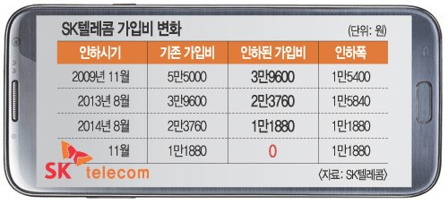 SKÅÚ·¹ÄÞÀº ÇöÀç 1¸¸1880¿øÀÎ ÈÞ´ëÀüÈ °¡ÀÔºñ¸¦ 11¿ù 1ÀϺηΠÆóÁöÇÑ´Ù°í 23ÀÏ ¹àÇû´Ù. SKÅÚ·¹ÄÞÀº 1996³â óÀ½ µµÀ﵃ ´ç½Ã 5¸¸5000¿øÀ̾ú´ø °¡ÀÔºñ¸¦ ±×µ¿¾È ´Ü°èÀûÀ¸·Î ÀÎÇÏÇØ ¿Ô´Ù. 2009³â 11¿ù 3¸¸9600¿øÀ¸·Î 1¸¸5400¿ø °¡ÀÔºñ¸¦ ³»¸° µ¥ À̾î Áö³ÇØ¿Í ¿ÃÇØ 8¿ù °¢°¢ 2¸¸3760¿ø, 1¸¸1880¿øÀ¸·Î °¡ÀÔºñ¸¦ °è¼Ó ÀÎÇÏÇß´Ù.