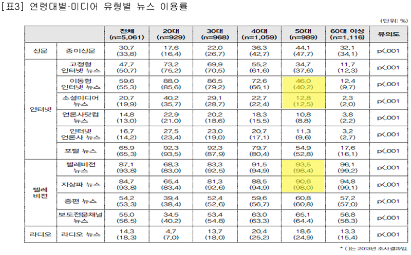 Áö»óÆÄ ´º½º ÀÌ¿ë ºñÀ²Àº ¸ðµç ¿¬·É´ë¿¡¼­ ÀÌ¿ë·üÀÌ Ç϶ôÇß½À´Ï´Ù. 2013³â°ú ºñ±³ÇØ 2014³â 9.1%p ¶³¾îÁø °ÍÀ¸·Î Á¶»çµÆ½À´Ï´Ù. ƯÈ÷ 50´ëÀÇ Áö»óÆÄ ´º½º ÀÌ¿ë ºñÀ²Àº 2013³â 98.0%¿¡¼­ 2014³â 90.6%·Î 7.4%p³ª ¶³¾îÁø °ÍÀ¸·Î ³ªÅ¸³µ½À´Ï´Ù.
