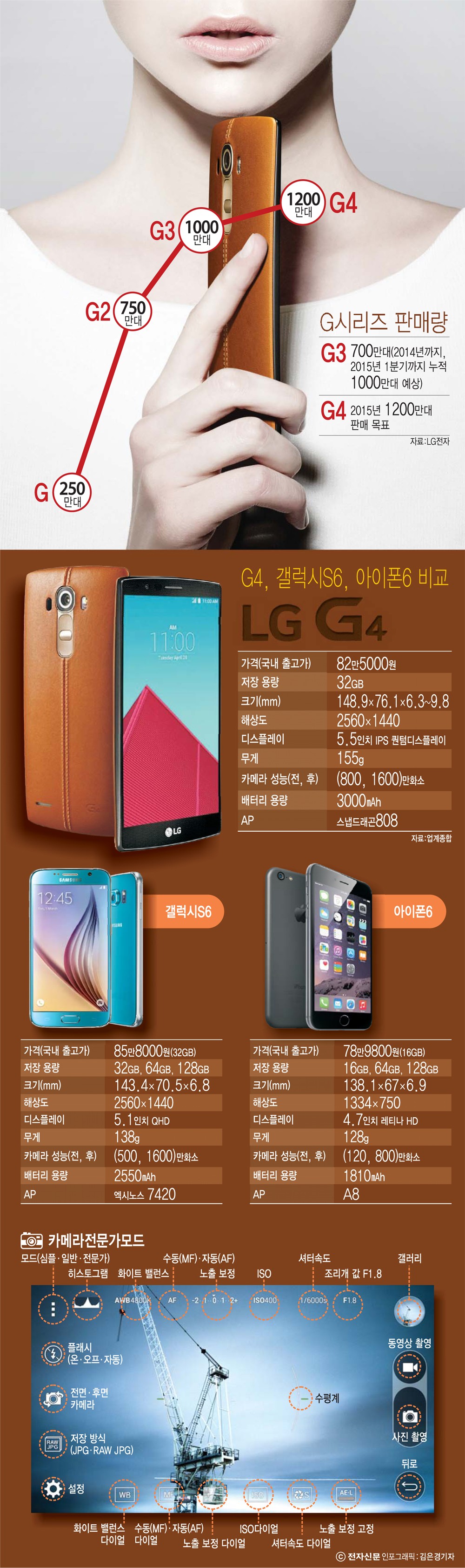 LGÀüÀÚ°¡ G4¸¦ Ãâ½ÃÇÏ¸ç °¶·°½ÃS6, ¾ÆÀÌÆù6¿Í Ä¡¿ÇÑ °æÀïÀ» ¿¹°íÇß´Ù. G4´Â ¾ÆÀÌÆù6(16GB)º¸´Ù 3¸¸5000¿©¿ø ºñ½Î°í °¶·°½ÃS6(32GB)º¸´Ù 3¸¸3000¿ø Àú·ÅÇÏ´Ù. ¶Ç °¶·°½ÃS6, ¾ÆÀÌÆù6¿Í ºñ±³ÇØ µð½ºÇ÷¹À̰¡ Å©°í ¹èÅ͸® ¿ë·®°ú Ä«¸Þ¶ó ¼º´ÉÀÌ ³ô´Ù.