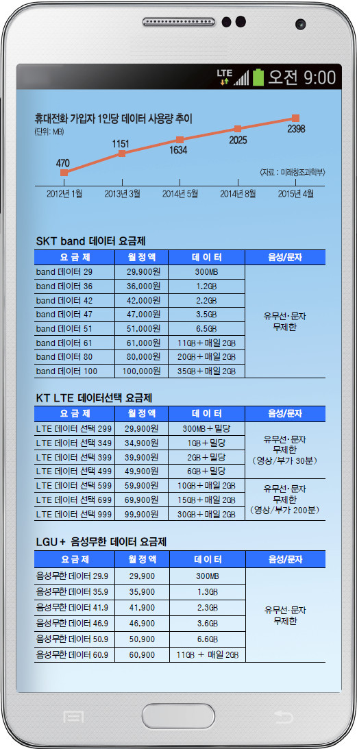 ÇÏÁö¸¸ Àå±âÀûÀ¸·Ð »ç¿ëÀÚµéÀÇ ¿ä±ÝÀº Á¡Â÷ ¿Ã¶ó°¥ ¼ö¹Û¿¡ ¾ø´Ù. µ¥ÀÌÅÍ »ç¿ë·®ÀÌ Áö¼ÓÀûÀ¸·Î Áõ°¡Çϰí Àֱ⠶§¹®ÀÌ´Ù. 1Àδç LTE Æò±Õ µ¥ÀÌÅÍ »ç¿ë·®ÀÎ 3.4GB¸¦ °ÆÁ¤ ¾øÀÌ ¾²·Á¸é SKÅÚ·¹ÄÞ ¡®¹êµå µ¥ÀÌÅÍ 47¡¯(¿ù 4¸¸7000¿ø¡¤µ¥ÀÌÅÍ 3.5GB), KT ¡®LTE ¼±Åà 499¡¯(¿ù 4¸¸9900¿ø¡¤µ¥ÀÌÅÍ 6GB), LGÀ¯Ç÷¯½º ¡®À½¼º¹«ÇÑ µ¥ÀÌÅÍ 46.9¡¯(¿ù 4¸¸6900¿ø¡¤µ¥ÀÌÅÍ 3.6GB)´Â ½á¾ß ÇÑ´Ù. ÇâÈÄ¿¡ Æò±Õ µ¥ÀÌÅÍ »ç¿ë·®ÀÌ Áõ°¡ÇÏ¸é »ç¿ëÀÚµéÀº ´õ ºñ½Ñ ¿ä±ÝÁ¦·Î À̵¿ÇÒ ¼ö¹Û¿¡ ¾ø´Ù.