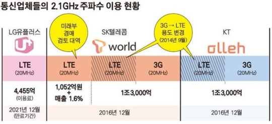 À̵¿Åë½Å¾÷üµé °£¿¡ Á֯ļö ÀüÀïÀÌ Ä¡¿­ÇÏ´Ù. SKÅÚ·¹ÄÞ°ú KT°¡ º¸À¯ÇÑ 2.1§× Á֯ļöÀÇ »ç¿ë ±â°£ÀÌ ³»³â ¸» Á¾·áµÇ¸é¼­ ´Ù½Ã ¹èºÐµÇ´Â ÀÌ Á֯ļö¸¦ Â÷ÁöÇϱâ À§Çؼ­´Ù.