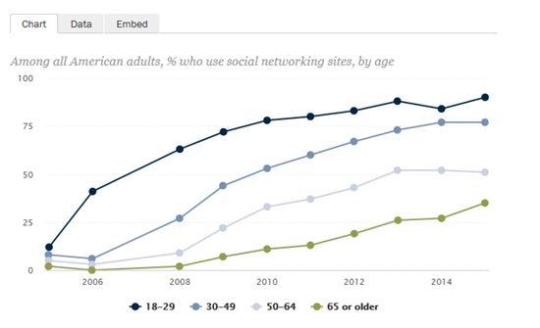 ³ëÀεéÀÇ SNS »ç¿ë Áõ°¡¿Í ´õºÒ¾î ´Ù¸¥ Á¶»ç Ç׸ñµéµµ ´«¿¡ ¶è´Ù. 2015³â ÇöÀç ¹Ì±¹ ³» ¼ºÀεé Áß 65%°¡ SNS ¼ºñ½º¸¦ ÀÌ¿ë Áß¿¡ ÀÖ´Ù. À̴ óÀ½ Á¶»ç¸¦ ½ÃÀÛÇß´ø 2005³â¿¡ ±â·ÏÇß´ø 7%¿¡ ºñÇØ Å©°Ô Áõ°¡ÇÑ ¼öÄ¡´Ù. °°Àº ±â°£ ÀÎÅÍ³Ý ÀÌ¿ë·üÀº 10%¿¡¼ 76%·Î Áõ°¡ÇØ ÀÎÅÍ³Ý »ç¿ëÀÚµé Áß »ó´ç¼ö°¡ SNSµµ °°ÀÌ ÀÌ¿ëÇÑ´Ù´Â °ÍÀ» ¾Ë ¼ö ÀÖ¾ú´Ù.