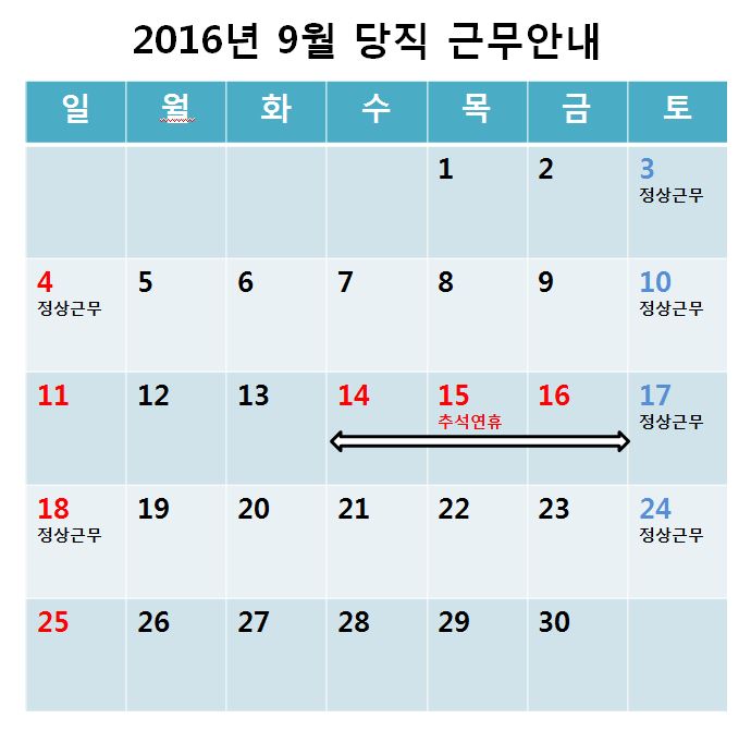[2016³â 9¿ù ÁÖ¸» ¹× °øÈÞÀÏ ´çÁ÷±Ù¹« ¾È³»]