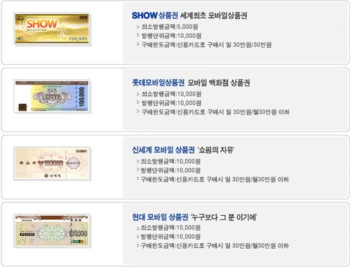 ·Ôµ¥, ½Å¼¼°è, Çö´ë ¹éÈ­Á¡ µî¿¡¼­ ¸ð¹ÙÀÏ»óǰ±ÇÀ» ÀÌ¿ëÇÒ ¼ö ÀÖ´Ù. ´Ü °³Àα¸¸ÅÇѵµ´Â °¢°¢ÀÇ »óǰ±Çº°·Î Àû¿ëµÇ´Â °ÍÀÌ ¾Æ´Ï¶ó ÀÌÅë»çº° ¼­ºñ½º Àüü¿¡¼­ Àû¿ëµÇ´Â ÇѵµÀ̱⠶§¹®¿¡ ÀÚ½ÅÀÌ ÈÞ´ëÆù °áÁ¦ ³»¿ªÀ» È®ÀÎÇÑ ÈÄ ±¸¸Å¸¦ ½ÅÃ»ÇØ¾ß ÇÑ´Ù. ½Å¿ëÄ«µå´Â ¿ù 30¸¸¿ø±îÁö ±¸¸Å°¡ °¡´ÉÇϸç ÈÞ´ëÆùÅëÇÕ°áÁ¦´Â ¿ù 5¸¸¿ø, ¿Â¶óÀÎÀÔ±ÝÀº 1ȸ 1,000¸¸¿ø±îÁö °¡´ÉÇÏ´Ù.(´Ü SKÅÚ·¹ÄÞÀº ¿Â¶óÀÎÀÔ±Ý ÀÏ 1ȸ 50¸¸¿ø, ¿ù 100¸¸¿ø±îÁö °¡´É)
