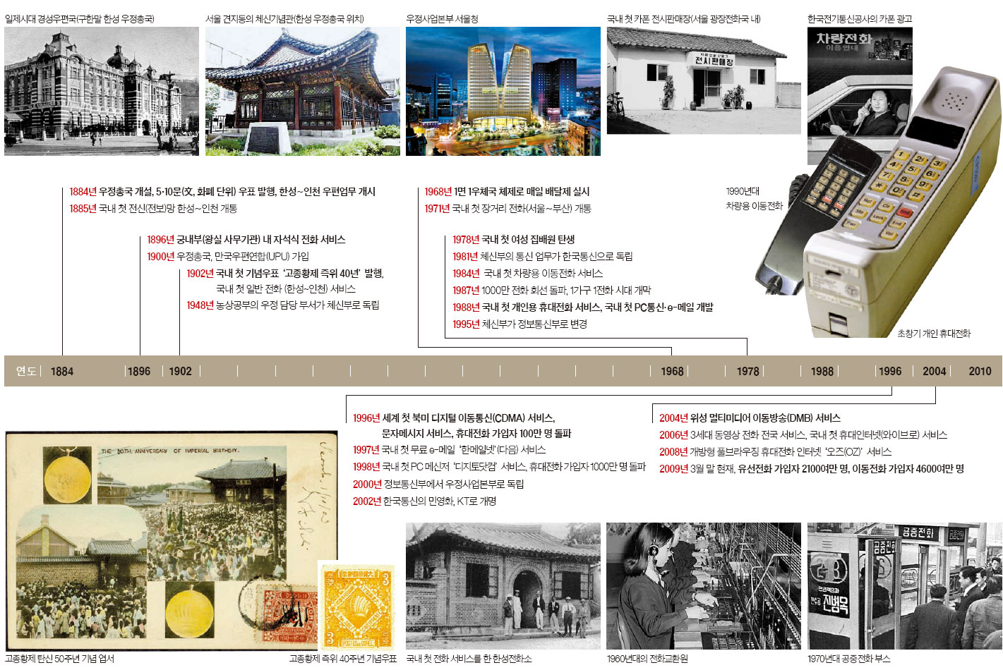 ¿ì¸®³ª¶ó ¼ÒÅë ¼ö´ÜÀÇ ¿øÁ¶´Â »ï±¹½Ã´ë¿¡±îÁö °Å½½·¯ ¿Ã¶ó°£´Ù. ½Å¶ó ¼ÒÁö¿Õ 9³âÀÎ 487³â ¡®ºñ·Î¼Ò »ç¹æ¿¡ ¿ì¿ª(éèæ¾)À» µÎ°í, °üûÀÌ °üµµ(ίԳ)¸¦ ¼ö¸®Çß´Ù¡¯´Â ±â·ÏÀÌ »ï±¹»ç±â¿¡ ÀÖ´Ù. ±×·¯³ª ÀÌ´Â Á¶¼±½Ã´ë ¸»±â±îÁö ¾Æ·§»ç¶÷À» ½ÃÄÑ °³ÀÎÀûÀ¸·Î ¼Ò½ÄÀ» ÀüÇϰųª ±¹°¡°¡ ±º»ç¡¤°ø¹«¿ëÀ¸·Î¸¸ Ȱ¿ëÇÏ´Â µ¥ ±×ÃÆ´Ù. ±×·¯´Ù ±¸ÇѸ» °³È­ÆÄ È«¿µ½Ä º´Á¶ÂüÆÇÀÌ ½Å»çÀ¯¶÷´ÜÀÇ ÀÏ¿øÀ¸·Î ÀϺ»¡¤¹Ì±¹À» µ¹¾Æº» µÚ °íÁ¾È²Á¦¿¡°Ô ¿ìÁ¤»ç¾÷À» °ÇÀÇÇϸ鼭 ±Ù´ë½Ä ¿ìÆíÁ¦µµÀÇ ¹ßÆÇÀÌ ¸¶·ÃµÆ´Ù. ´©±¸³ª ÀÏÁ¤ ¿ä±Ý¸¸ ³»¸é Áö¿ª¡¤°Å¸®¿¡ °ü°è¾øÀÌ Åë½Åºñ¹ÐÀ» º¸Àå¹ÞÀ¸¸ç ¼Ò½ÄÀ» ¾Ë¸®´Â ¹ü±¹¹Î ¼ÒÅë½Ã´ë°¡ ¿­¸° °ÍÀÌ´Ù. 1884³â ¼­¿ï °ßÁöµ¿ÀÇ Çö ü½Å±â³ä°ü ÀÚ¸®¿¡ °³¼³µÈ ¿ìÁ¤Ãѱ¹Àº 5¡¤10¹®(Ùþ¡¤È­Æó ´ÜÀ§) ¿ìÇ¥¸¦ ¹ßÇàÇϰí, ÇѼº(Çö ¼­¿ï)ÀÇ ¿ìÁ¤Ãѱ¹°ú ÀÎõ ºÐ±¹ °£ ¿ìÆí¾÷¹«¸¦ °³½ÃÇß´Ù. ¿ìÁ¤Ãѱ¹Àº 1900³â¿¡ ¸¸±¹¿ìÆí¿¬ÇÕ(UPU)¿¡ °¡ÀÔÇß´Ù. 1902³â¿¡´Â °íÁ¾È²Á¦ ÁïÀ§ 40³âÀ» °æÃàÇÏ´Â ¡®¾î±Ø ±â³ä¿ìÇ¥¡¯¸¦ ¹ßÇàÇß´Ù. À̰ÍÀÌ ±¹³» ù ±â³ä¿ìÇ¥·Î ±â·ÏµÈ´Ù. 1948³â¿¡´Â ³ó»ó°øºÎÀÇ ¿ìÁ¤¾÷¹«°¡ ü½ÅºÎ(95³â Á¤º¸Åë½ÅºÎ, 2000³â ¿ìÁ¤»ç¾÷º»ºÎ)·Î µ¶¸³Çß´Ù. 68³â ¡®1¸é Áö¿ª 1¿ìü±¹¡¯ ±¸ÃàÀÌ ¿Ï·áµÇ¸é¼­ ¸ÅÀÏ ¹è´ÞÁ¦°¡ ½ÃÇàµÆ´Ù. 78³â¿£ ù ¿©¼º Áý¹è¿ø(±èÀμ÷¾¾)ÀÌ Åº»ýÇß´Ù.