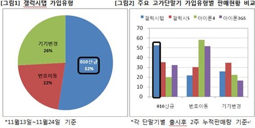 °¡ÀÔÀ¯Çüº°·Î´Â 010 ½Å±Ô°¡ÀÔÀÚÀÇ ºñÁßÀÌ 52%·Î °¡Àå ³ôÀº °¡¿îµ¥, ±â±âº¯°æ 26%, º¯È£À̵¿ 22%·Î Á¶»çµÆ´Ù. ´Ù¸¥ ½º¸¶Æ®Æù ´Ü¸»±âÀÇ ÃÊ±â ÆÇ¸Å·®°ú ºñ±³Çغ¸¸é 010 ½Å±Ô°¡ÀÔÀÚÀÇ ºñÁßÀÌ ¿ùµîÈ÷ ³ôÀº °ÍÀ» ¾Ë ¼ö ÀÖ´Ù.