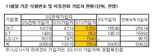 Á¤ºÎ´Â À̰°Àº ¹®Á¦¸¦ ÇØ°áÇϱâ À§ÇØ ³»³â 1¿ù 1ÀϺÎÅÍ ÇѽÃÀûÀ¸·Î 3³âµ¿¾È 01¡¿ ½Äº°¹øÈ£¸¦ »ç¿ëÇÏ´Â 2G °¡ÀÔÀڵ鵵 3G¼­ºñ½º·Î ÀüȯÇÒ ¼ö ÀÖµµ·Ï Çã¿ëÇß´Ù. ´Ü, Åë½Å¾÷ü¸¦ ¹Ù²ÙÁö ¾Ê´Â °æ¿ì¿¡ ÇÑÇØ¼­´Ù. ¶Ç 01¡¿ ¹øÈ£·Î 3G¿¡ °¡ÀÔÇÏ´Â ÀÌ¿ëÀÚµéÀº 010 ¹øÈ£µµ ÀÚµ¿À¸·Î ºÎ¿©¹Þ´Â´Ù. ±âÁ¸ ¹øÈ£¸¦ ÀÌ¿ëÇÒ ¼ö ÀÖÁö¸¸, 3³âÈÄ¿¡´Â 010 ¹øÈ£·Î °­Á¦ ÀüȯµÈ´Ù.