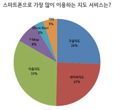 ¡®½º¸¶Æ®ÆùÀ¸·Î °¡Àå ¸¹ÀÌ ÀÌ¿ëÇÏ´Â Áöµµ ¼ºñ½º´Â¡¯À̶õ Áú¹®¿¡ ÀÀ´äÀÚÀÇ 33%´Â ¡®´ÙÀ½ Áöµµ¡¯¸¦ ²Å¾ÒÀ¸¸ç ¡®±¸±Û Áöµµ¡¯°¡ 26% µæÇ¥À²·Î µÚ¸¦ À̾ú´Ù. ¡®³×À̹ö Áöµµ¡¯´Â ±¸±Û Áöµµº¸´Ù Á¶±Ý ³·Àº 25% µæÇ¥À²·Î 3À§¸¦ ±â·ÏÇßÀ¸¸ç ¡®T¸Ê¡¯, ¡®¼î³»ºñ¡¯ µîÀÌ °¢°¢ 8%, 3%·Î 4, 5À§¿¡ ¿Ã¶ú´Ù. ´ÙÀ½¡¤±¸±Û¡¤³×À̹ö Áöµµ ÀÌ¿ëÀÚ ºñÀ²À» ÇÕÇϸé 84%·Î ±¸±ÛÀ» Æ÷ÇÔÇÑ Æ÷ÅÐ Áöµµ ÀÌ¿ëÀÚ°¡ ´ë´Ù¼ö¸¦ Â÷ÁöÇß´Ù.