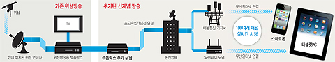 ±âÁ¸ÀÇ À§¼º¹æ¼ÛÀº Áý¿¡ ¼³Ä¡µÈ À§¼º ¾ÈÅ׳ª°¡ ¹æ¼Û ½ÅÈ£¸¦ ¹Þ¾Æ ¼ÂÅé¹Ú½º·Î Àü´ÞÇϸé À̸¦ TV¿¡¼­ º¸¿©ÁÖ´Â °ÍÀ̾ú´Ù. »õ ±â¼úÀº ¿©±â¿¡ ¼ÂÅé¹Ú½º¸¦ Çϳª ´õ Ãß°¡ÇØ ¶È°°Àº ¹æ¼Û½ÅÈ£¸¦ ÀÎÅÍ³Ý °ø°£¿¡µµ µ¿½Ã¿¡ »Ñ¸®°í À̸¦ ½º¸¶Æ®ÆùÀÌ ¹Þ¾Æ³»µµ·Ï ÇÏ´Â °ÍÀÌ´Ù. µû¶ó¼­ Áý¿¡¼­ TV¸¦ ÄѳõÁö ¾Ê¾Æµµ µÎ ¼ÂÅé¹Ú½º¿¡ Àü¿øÀÌ µé¾î¿Í ÀÖÀ¸¸é Áý ¹Û¿¡¼­ ÀÚÀ¯·Ó°Ô ½º¸¶Æ®ÆùÀ» ÅëÇØ TV¸¦ º¼ ¼ö ÀÖ´Ù. ¿ÍÀÌÆÄÀ̰¡ °¡´ÉÇÑ Áö¿ªÀ̶ó¸é ÇØ¿Ü ÃâÀåÀ» °¡¼­µµ Çѱ¹ÀÇ ¹æ¼Ûä³ÎÀ» °ÅÀÇ ½Ç½Ã°£À¸·Î º¼ ¼ö ÀÖ´Ù.
