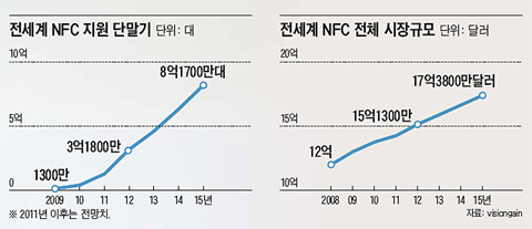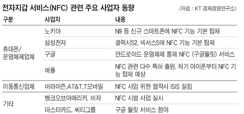 ¼¼°è IT¡¤±ÝÀ¶¾÷°è¿¡¼­´Â NFC ÀüÀÚÁö°© ½ÃÀåÀ» ¼±Á¡Çϱâ À§ÇÑ °æÀïÀÌ º»°ÝÀûÀ¸·Î ºÒºÙ¾ú´Ù. 2015³âÀÌ¸é ¼¼°è ÈÞ´ëÆùÀÇ ¾à Àý¹ÝÀÌ NFC ÀüÀÚÁö°©À» žÀçÇÑ´Ù´Â Àü¸Á±îÁö ³ª¿Â´Ù. ÀϺο¡¼­´Â £§°Åǰ£§À̶ó´Â ¿ì·Áµµ ³ª¿Â´Ù.