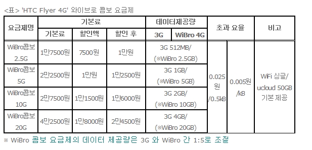 KT(ȸÀå À̼®Ã¤ www.kt.com)´Â ¿ÍÀ̺ê·Î 4G¸¦ Áö¿øÇÏ´Â ½º¸¶Æ®Æù ¡®HTC EVO 4G+£§¿Í ÅÂºí¸´PC £§HTC Flyer 4G£§ Ãâ½Ã¿Í ÇÔ²² Àü¿ë ¿ä±ÝÁ¦¸¦ °ø°³Çß´Ù°í 1ÀÏ ¹àÇû´Ù. À̹ø ¿ä±ÝÁ¦ °ø°³·Î 3W(WCDMA(3G), WiFi, Wibro 4G)¸¦ Áö¿øÇÏ´Â ÀÌ ´Ü¸» 2Á¾Àº Ãß°¡¿ä±Ý ¾øÀÌ ÇϳªÀÇ ¿ä±ÝÁ¦·Î Æí¸®ÇÏ°í ºÎ´ã¾øÀÌ ÀÌ¿ëÇÒ ¼ö ÀÖ°Ô µÆ´Ù.
