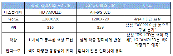 £§¿ÉƼ¸Ó½º LTE£§´Â LGµð½ºÇ÷¹ÀÌ(034220)(20,050¿ø 0 0.00%)°¡ °³¹ßÇÑ AH(Advanced High performance)-IPS LCD¸¦, £§°¶·°½ÃS2 HD LTE£§´Â »ï¼º¸ð¹ÙÀϵð½ºÇ÷¹ÀÌÀÇ HD AMOLED(´Éµ¿Çü À¯±â¹ß±¤´ÙÀÌ¿Àµå)¸¦ ÀåÂøÇß´Ù. ÇØ»óµµ´Â µÑ ´Ù 1280X720·Î HD±ÞÀÌÁö¸¸, ÀÎÄ¡´ç Çȼ¿¼ö(PPI)´Â LG(329PPI)°¡ »ï¼º(316PPI)À» ±Ù¼ÒÇÏ°Ô ¾Õ¼±´Ù.
