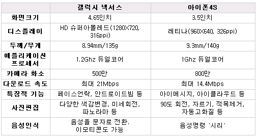 ¶Ç °¶·°½Ã ³Ø¼½º°¡ ´õ ³ôÀº ÇØ»óµµ¿Í Å« ȸéÀ» °®Ãè´Ù. ´Ü, ÀÎÄ¡´ç Çȼ¿¼ö´Â 316ppiÀÇ °¶·°½Ã ³Ø¼½ºº¸´Ù 326ppiÀÇ ¾ÆÀÌÆù4S°¡ ³ô´Ù. Ä«¸Þ¶ó ȼҼöµµ ¾ÆÀÌÆù4S°¡ 800¸¸ ȼҷΠ°¶·°½Ã ³Ø¼½ºÀÇ 500¸¸È¼Òº¸´Ù ¾Õ¼±´Ù.