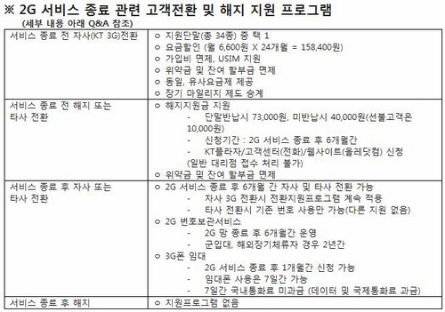 = ¹ÌÀüȯ »ç¿ëÀÚ¿¡ ´ëÇØ¼­´Â ¼­ºñ½º Á¾·á ÈÄ¿¡µµ 2G ÀüÈ­¹øÈ£¸¦ 6°³¿ù°£ º¸Á¸ÇØ ÁØ´Ù. °í°´ÀÌ Èñ¸ÁÇÏ¸é ¾ðÁ¦¶óµµ 2G ¹øÈ£¸¦ ÀÌ¿ëÇØ KT ¹× Ÿ»ç 3G Åë½Å ¼­ºñ½º·Î ÀüȯÀÌ °¡´ÉÇÏ´Ù. ÀÌ ±â°£ µ¿¾È¿¡´Â KT 3G·Î Àüȯ½Ã Áö¿øÇÁ·Î±×·¥À» Áö¼ÓÀûÀ¸·Î ¿î¿µÇÒ °èȹÀÌ´Ù(´Ü¸» Ư°¡ Á¦°ø ¹× ¿ä±Ý ÇÒÀÎ ÇÁ·Î¸ð¼Ç Àû¿ë µî).