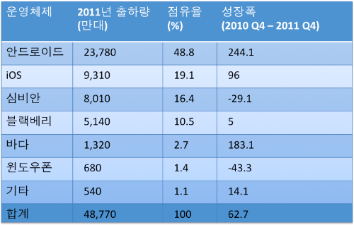 2011³â ÃâÇÏµÈ ½º¸¶Æ®ÆùÀ» ¿î¿µÃ¼Á¦º°·Î »ìÆìº¸¸é ´Ü¿¬ ±¸±Û ¾Èµå·ÎÀ̵åÀÇ ¾Ð½ÂÀÌ´Ù. ¾Èµå·ÎÀÌµå ½º¸¶Æ®ÆùÀº ÃÑ 2¾ï3780¸¸´ë°¡ ÃâÇϵƴÙ. ¾ÖÇà iOS´Â 9310¸¸´ë, ³ëŰ¾Æ ½Éºñ¾ÈÀº 8010¸¸´ë°¡ °¢°¢ ¸¸µé¾îÁ³´Ù.
