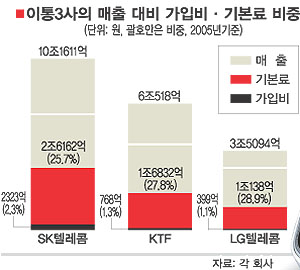 ¡ß°¡ÀÔºñ¡¤±âº»·á ³Ê¹« ºñ½Î´Ù=Áö³­ÇØ ÀÌÅë 3»ç°¡ °¡ÀÔºñ, ±âº»¿ä±ÝÀ¸·Î ¹ú¾îµéÀÎ µ·Àº 5Á¶6622¾ï¿ø. ÀÌ´Â Àüü ¸ÅÃâ 19Á¶7223¾ï¿øÀÇ 28.7%¿¡ À̸£´Â ¼öÄ¡´Ù. ÈÞ´ëÀüÈ­·Î ÀÎÅͳݿ¡ Á¢¼ÓÇÏ´Â ¹«¼±ÀÎÅÍ³Ý ¸ÅÃâÀ» »« ¡®À½¼º¸ÅÃ⡯¸¸ µûÁø´Ù¸é ÀÌ ºñÁßÀº 40%´ë·Î ²±Ãæ ¶Ù°Ô µÈ´Ù. ¡®ÅëÈ­·®¸¸Å­ ¿ä±ÝÀ» ³½´Ù¡¯°í ¿©±â±â ½¬¿î °¡ÀÔÀڷμ­´Â ÀÌÅë»ç°¡ ÀÌó·³ °¡ÀÔºñ¿Í ±âº»¿ä±Ý¸¸À¸·Î ¸·´ëÇÑ µ·À» ¹ú¾îµéÀÏ ¼ö ÀÖ´Â ¼öÀÔ±¸Á¶¸¦ ½±°Ô ³³µæÇÏ±â ¾î·Æ´Ù.