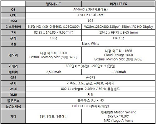 µÎ Á¦Ç°Àº ÃÖ±Ù LTE ½º¸¶Æ®Æù¿¡ °øÅëÀûÀ¸·Î žÀçµÇ´Â Ä÷ÄÄ ½º³Àµå·¡°ï 1.5Ghz µà¾óÄÚ¾î ÇÁ·Î¼¼½º, ¾Èµå·ÎÀ̵å 2.3 ÁøÀúºê·¹µå, Èĸé 800¸¸ È­¼Ò ¹× Àü¸é 200¸¸ È­¼ÒÀÇ Ä«¸Þ¶ó µî °ÅÀÇ °øÅëµÈ ½ºÆåÀ» °¡Áö°í ÀÖ´Ù. ¹Ý¸é µð½ºÇ÷¹ÀÌ, Å©±â ¹× ¹«°Ô, ³»Àå ¸Þ¸ð¸®, º£Å͸® ¿ë·®¿¡¼­ Â÷À̸¦ º¸¿´´Ù.