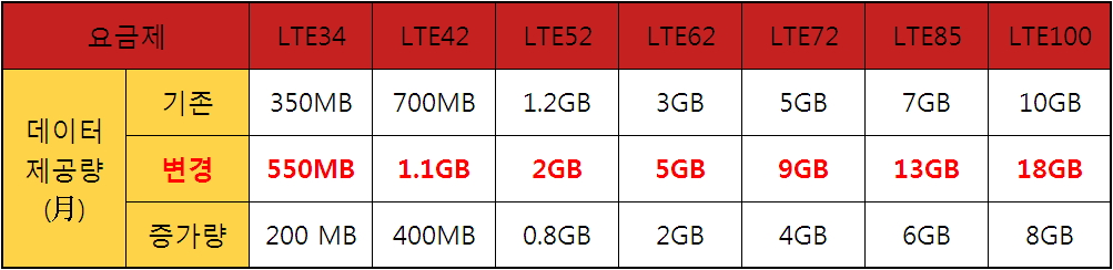 °¡Àå ¸¹Àº »ç¿ëÀÚµéÀÌ ÀÌ¿ëÇÏ´Â LTE62 ¿ä±ÝÁ¦ÀÇ °æ¿ì 3GB¿¡¼­ 5GB·Î ´Ã¾î³ª¸ç, Àû°Ô´Â 200MB(LTE34)ºÎÅÍ ¸¹°Ô´Â 8GB(LTE100)±îÁö È®´ëÇß´Ù.