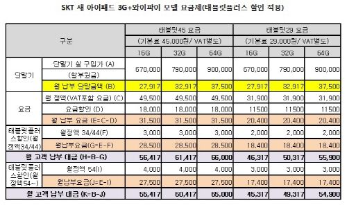 SKÅÚ·¹ÄÞ°ú KT ¸ðµÎ »õ ¾ÆÀÌÆÐµå ½Ç±¸ÀÔ°¡(ÇҺοø±Ý)Àº ¶È°°´Ù. ¿ä±ÝÇÒÀÎÀ» Á¦¿ÜÇÑ Åë½Å»ç ´Ü¸»±â Áö¿øÀÌ µé¾î°£ »õ ¾ÆÀÌÆÐµå(3G+¿ÍÀÌÆÄÀÌ)ÀÇ ½Ç±¸ÀÔ°¡´Â 16GB 67¸¸¿ø, 32GB 79¸¸¿ø, 64GB 90¸¸¿øÀÌ´Ù.
