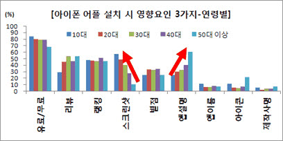 16ÀÏ KTH¿Í ÆÌ°ÔÀÌÆ®°¡ ½Ç½ÃÇÑ `2012³â 1ºÐ±â ½º¸¶Æ®Æù ÀÌ¿ëÀÚ Á¶»ç`¿¡ µû¸£¸é, ¸ð¹ÙÀÏ ¾ÛÀ» ¼±ÅÃÇÒ ¶§ 10~30´ë ÀþÀº ÃþÀº ½ºÅ©¸°¼¦°ú ¹Ì¸®º¸±â °°Àº ½Ã°¢Àû ¿ä¼Ò¸¦, 40~50´ë´Â ¾Û ¼³¸í °°Àº ÅØ½ºÆ®¸¦ Áß¿ä½ÃÇÏ´Â °ÍÀ¸·Î ³ªÅ¸³µ´Ù. ¶Ç ¾ÛÀ» ¼±ÅÃÇÒ ¶§ 10~30´ë´Â Àα⠸޴º¸¦ ¸¹ÀÌ ÂüÁ¶ÇßÁö¸¸, ¿¬·É´ë°¡ ³ô¾ÆÁú¼ö·Ï °ËÁõµÈ Ãßõ ¸Þ´º¿¡ ´ëÇÑ ¼±È£°¡ °­ÇÏ°Ô ³ªÅ¸³µ´Ù.