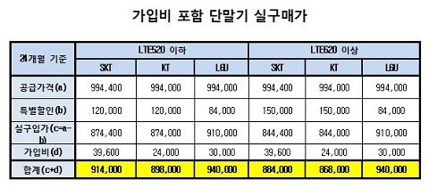 ¶§¹®¿¡ °¡ÀÔºñ¸¦ Æ÷ÇÔÇÑ ÀÌÅë»çº° ´Ü¸»±â ½Ç ±¸ÀÔ°¡¸¦ µûÁö¸é, LTE 52 ¿ä±ÝÁ¦ ÀÌÇÏ¿¡¼­´Â KT 89¸¸8õ¿ø, SKÅÚ·¹ÄÞ 91¸¸4õ¿ø, LGÀ¯Ç÷¯½º 94¸¸¿ø, LTE 62 ¿ä±ÝÁ¦ À̻󿡼­´Â KT 86¸¸8õ¿ø, SKÅÚ·¹ÄÞ 88¸¸4õ¿ø, LGÀ¯Ç÷¯½º 94¸¸¿øÀÌ´Ù.