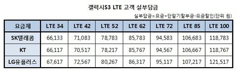 °á·ÐÀûÀ¸·Î ¸»Çϸé ÀÌÅë3»ç Áß °¶·°½ÃS3 LTEÀÇ ½ÇºÎ´ã±ÝÀÌ °¡Àå ÀûÀº °÷Àº KT¿´´Ù. KT´Â LTE 34 ¿ä±ÝÁ¦¿¡¼­ºÎÅÍ LTE 100 ¿ä±ÝÁ¦¿¡ À̸£±â±îÁö ¸ðµÎ ÀÌÅë3»ç Áß °¡Àå Àú·ÅÇß´Ù.