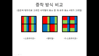 ÇÏÁö¸¸ ½ÇÁ¦·Î´Â ÇØ»óµµ¸¦ ÈξÀ ²ø¾î¿Ã¸° °ÍÀ¸·Î Æò°¡¹Þ°í ÀÖ´Ù. °¶·°½Ã³ëÆ®³ª °¶·°½ÃS3¸¦ Æ÷ÇÔÇØ ±âÁ¸ ½º¸¶Æ®Æù µð½ºÇ÷¹ÀÌ¿¡ Àû¿ëÇÑ ÁõÂø ¹æ½ÄÀÌ `ÆæÅ¸ÀÏ`À̾ú±â ¶§¹®ÀÌ´Ù. ÆæÅ¸ÀÏ ¹æ½ÄÀº ÇÑ Çȼ¿(ȼÒ)¿¡ Àû(R)¡¤³ì(G)À̳ª û(B)¡¤³ì(G)¸¸À» ³ÖÀº ÁõÂø ¹æ½ÄÀ» ¸»ÇÑ´Ù. »ö±òÀ» Á¤È®ÇÏ°Ô ±¸ÇöÇϱâ À§Çؼ´Â È¼Ò Çϳª¿¡ RGB À¯±â¹°ÀÌ ¸ðµÎ µé¾î°¡¾ß ÇÏÁö¸¸, È¼Ò Å©±â°¡ ÀÛ¾ÆÁú¼ö·Ï ÁõÂøÀÌ ¾î·Æ´Ù. R°ú BÀÇ Å©±â¸¦ Ű¿ì°í ¹ø°¥¾Æ ¹èÄ¡ÇÑ ÆæÅ¸ÀÏ ¹æ½ÄÀÌ È°¿ëµÈ ÀÌÀ¯´Ù.