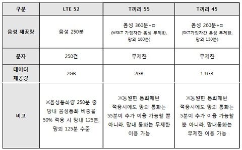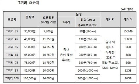 ¡®T³¢¸® ¿ä±ÝÁ¦¡¯´Â 35, 45, 55, 65, 75, 85, 100 µî 7Á¾ÀÌ´Ù. ÀÌ ¿ä±ÝÁ¦¿¡ °¡ÀÔÇÏ´Â SKÅÚ·¹ÄÞ °í°´Àº ÀÚ»ç °¡ÀÔÀÚ°£ À½¼º ÅëÈ­»Ó¸¸ ¾Æ´Ï¶ó Ÿ»ç °í°´°úµµ SMS(°Ç´ç 20¿ø)¿Í MMS(°Ç´ç 100¿ø), Á¶ÀÎ(äÆÃ)À» ¹«Á¦ÇÑ ÀÌ¿ëÇÒ ¼ö ÀÖ´Ù. ¡®T³¢¸® ¿ä±ÝÁ¦¡¯ °¡ÀÔÀº LTE»Ó¸¸ ¾Æ´Ï¶ó 3G °í°´µµ °¡´ÉÇÏ´Ù.