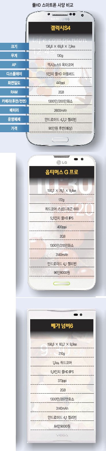 ÃÖ±Ù °¢ Á¦Á¶»ç°¡ ³»³õÀº Ç÷¡±×½Ê Á¦Ç°µéÀº »ç¾çÀÌ Å« Â÷ÀÌ ¾øÀÌ ¾ùºñ½ÁÇÏ´Ù. ÄõµåÄÚ¾î ¾îÇø®ÄÉÀÌ¼Ç ÇÁ·Î¼¼¼(AP), 2GB ¸Þ¸ð¸®, Ç®HD(1920¡¿1080) µð½ºÇ÷¹ÀÌ, 1300¸¸ È¼Ò Ä«¸Þ¶ó µîÀÌ °øÅë »ç¾çÀ¸·Î žÀçµÅ ÀÖ´Ù. ÀÌ·¸´Ùº¸´Ï Á¦Á¶»çµéÀº Àú¸¶´Ù ÀڽۨÀ» ³»ºñÄ¡°í ÀÖ´Ù. ¾Õ¼°¡´Â »ï¼ºÀüÀÚ´Â ºê·£µå ÆÄ¿ö¸¦ ¹ÙÅÁÀ¸·Î °¶·°½ÃS4¸¦ ÅëÇØ °æÀïÀÚµéÀ» ¸ÖÂġ µûµ¹¸®°Ú´Ù´Â ż¼´Ù. ¹Ý¸é LG¿Í ÆÒÅà µî ÈĹßÁÖÀÚ µîÀº µ¿µîÇÑ »ç¾çÀ» ³»¼¼¿ö À̹ø ±âȸ¿¡ »ï¼ºÀüÀÚ¸¦ µû¶óÀâ°Ú´Ù´Â ½É»êÀÌ´Ù.