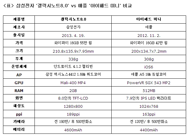 ÇÏÁö¸¸ À̿ܿ¡ Çϵå¿þ¾î ¼º´ÉÀ̳ª ±â´É»óÀÇ ´Ù¾ç¼ºÀº ¡®°¶·°½Ã³ëÆ®8.0¡¯ÀÌ ¾Õ¼±´Ù. ¡®°¶·°½ÃS3£§¿Í ¡¯°¶·°½Ã³ëÆ®2¡®¿¡ žÀçÇÑ »ï¼º ÀÚü ÄõµåÄÚ¾î ÇÁ·Î¼¼¼ÀÎ ¡¯¿¢½Ã³ë½º4412¡®°¡ ½Ç·È´Ù. GPU´Â ¸»¸®(Mali)-400ÀÌ´Ù. ·¥(RAM)Àº 2GB·Î ¡¯¾ÆÀÌÆÐµå ¹Ì´Ï¡®º¸´Ù Àü¹ÝÀûÀ¸·Î ³ôÀº ¼º´ÉÀ» °®Ãè´Ù. ¾ÖÇà ¡¯¾ÆÀÌÆÐµå ¹Ì´Ï¡®ÀÇ °æ¿ì ±âÁ¸ ¡¯¾ÆÀÌÆÐµå2¡®¿Í ºñ½ÁÇÑ Çϵå¿þ¾î ½ºÆåÀ» °®Ãß°í ÀÖ´Ù. 1§× µà¾óÄÚ¾î ÇÁ·Î¼¼¼ÀÎ A5¿Í 512MB ·¥(RAM)À» °®Ãè´Ù. GPU´Â ÆÄ¿öVR SGX 543MP2°¡ ÀåÂøµÆ´Ù.