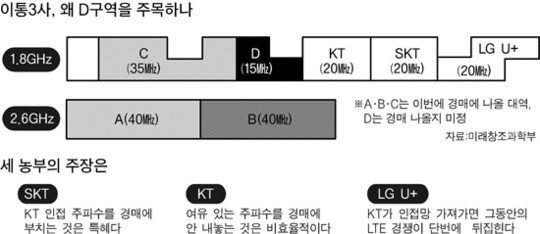 ¡¡3»çÀÇ ±â½Î¿òÀÌ º»°ÝÈÇÑ °Ç ¹æ¼ÛÅë½ÅÀ§¿øÈ¸°¡ Áö³ÇØ 12¿ù ¹ßÇ¥ÇÑ Á֯ļö ÇÒ´ç ´ë¿ª¿¡ KT°¡ ÇöÀç »ç¿ëÇÏ´Â 1.8§×ÀÇ ÀÎÁ¢ ´ë¿ªÀÌ °Å·ÐµÇ¸é¼ºÎÅÍ´Ù. KT°¡ ÀÌ Á֯ļö¸¦ ³«Âû¹ÞÀ» °æ¿ì ±âÁ¸¿¡ ½á¿Â ´ë¿ª°ú ÀÚ¿¬½º·´°Ô ÇÕÃÄÁ® Ÿ»çº¸´Ù ±¤´ë¿ª LTE ±¸Ãà¿¡ À¯¸®ÇØÁø´Ù. °æ¸Å¿¡ ³ª¿Ã ´Ù¸¥ ¼¼ °÷ÀÇ ´ë¿ªÀº ¸ðµÎ ±âÁ¸¿¡ ¾²´Â ¸Á°ú ¶³¾îÁ® ÀÖ´Ù. ±×·¡¼ £§¹®Àü¿Á´äÀ» °æ¸Å¿¡ ³»³õ´À³Ä ¸¶´À³Ä£§°¡ ¶ß°Å¿î °¨ÀÚ´Ù. ´ç¿¬È÷ KT´Â Àû±Ø Âù¼º, SKT¿Í LGÀ¯Ç÷¯½º´Â °á»ç ¹Ý´ë´Ù.