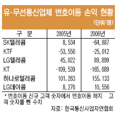 KTÀÇ 16¸¸5689¸í ¼Õ½ÇÀº Àü³âÀÇ ¡®¸¶À̳ʽº 10¸¸9539¸í¡¯º¸´Ù 51%³ª ´Ã¾î³­ ¼öÄ¡´Ù. ¹Ý¸é ½Ã³»ÀüÈ­ ÈĹ߻çÀÎ Çϳª·ÎÅÚ·¹ÄÞ°ú LGµ¥ÀÌÄÞÀÇ °¢°¢ 2006³â ¹øÈ£À̵¿ ÀÌÀÍÀº 2005³â ´ëºñ ¹«·Á 53%, 27%³ª Áõ°¡Çß´Ù.