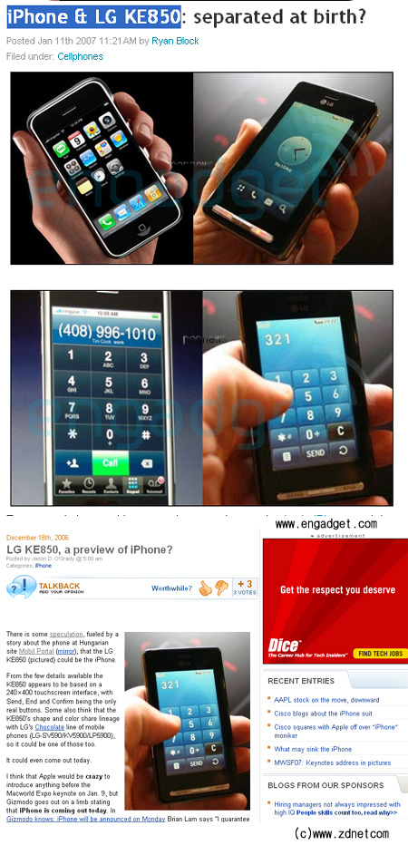 Áö³ 12¿ù Çë°¡¸®ÀÇ ¸ð¹ÙÀÏ Æ÷ÅÐ(www.mobilport.hu)ÀÌ ´ç½Ã °ø°³°¡ ÀÓ¹ÚÇß´ø ¾ÆÀÌÆùÀº ¹Ù·Î LG KE850ÀÏ °ÍÀ̶ó´Â ÁÖÀåÀ» Á¦±âÇß´Ù. ȤÀº LGÀÇ ½ÅÇüÆùÀÌ ¾ÆÀÌÆùÀÇ ¡®¿¹°íÆí¡¯À̶ó´Â ÃßÃøµµ ³¹«Çß´Ù. ÀÌ·± ÁÖÀå°ú ¼Ò¹®Àº ¾ÆÀÌÆùÀ» ±â´Ù¸®´ø ¼±¸ ³×ƼÁðµéÀÇ ½Ã¼±À» Àâ¾Æ ²ö °Í¿¡ ¸Ó¹°Áö ¾Ê°í IT ´º½º »çÀÌÆ®ÀÎ ZDNet¿¡ ¼Ò°³µÇ±âµµ Çß´Ù.
