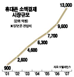 ÈÞ´ëÆù °áÁ¦´Â ¼Ò¾×°áÁ¦ ¹× Ä«µå°áÁ¦·Î ´ëº°µÈ´Ù. ÈÞ´ëÆù °áÁ¦´Â Áö³ 2001³âºÎÅÍ ¼Ò¾×°áÁ¦¸¦ Áß½ÉÀ¸·Î ´ëÁßȵDZ⠽ÃÀÛÇß´Ù. ÈÞ´ëÆù ¼Ò¾×°áÁ¦´Â Áֹεî·Ï¹øÈ£ µî °³ÀÎÁ¤º¸¸¦ ÀÔ·ÂÇÑ ÈÄ ¹®ÀÚ¸Þ½ÃÁö(SMS)·Î ½ÂÀÎÀ» ¾òÀº ÈÄ °áÁ¦¸¦ ¸¶Ä¡´Â ½Ã½ºÅÛÀÌ´Ù. ÈÞ´ëÆù °áÁ¦ ¾÷üÀÎ ¸ðºô¸®¾ð½º¿¡ µû¸£¸é ¿ÃÇØ ÈÞ´ëÆù ¼Ò¾×°áÁ¦ ½ÃÀå ±Ô¸ð´Â 1Á¶3,000¾ï¿øÀ¸·Î Áö³ÇØ(9,600¾ï¿ø)º¸´Ù 35.4%³ª ¼ºÀåÇÒ Àü¸ÁÀÌ´Ù.