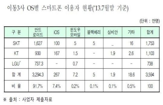 ÀÌ ÀÚ·á´Â Åë½Å 3»ç°¡ ¹Ì·¡ºÎ¿¡ Àü´ÞÇÑ ÀÚ·á´Ù. OSº° ÇöȲ±îÁö ´ã¾Ò´Ù. ±¹³» ½º¸¶Æ®Æù »ç¿ëÀÚ°¡ ÀÌ¿ëÇÏ´Â OS´Â ¡ã¾Èµå·ÎÀÌµå ¡ã¾ÆÀÌ¿À¿¡½º ¡ãÀ©µµ¸ð¹ÙÀÏ ¡ãºí·¢º£¸® ¡ã½Éºñ¾È ¡ã±âŸ·Î ºÐ·ùÇß´Ù. ±×µ¿¾È ±¹³» ½ÃÆÇµÈ ½º¸¶Æ®ÆùÀ» °¨¾ÈÇÏ¸é ±âŸ´Â Áö±ÝÀº Áß´ÜµÈ ¹Ù´Ù OS·Î ºÐ¼®µÈ´Ù.