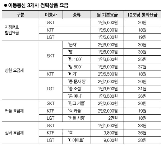 °¡Á· ȤÀº Ä£±¸, ÀÚÁÖ ÅëÈ­ÇÏ´Â »ç¶÷ÀÌ Á¤ÇØÁ® ÀÖ´Ù¸é ¡®ÁöÁ¤¹øÈ£ ÇÒÀÎ ¿ä±ÝÁ¦¡¯¸¦ ¼±ÅÃÇÏ´Â °Ô À¯¸®ÇÏ´Ù. ÀÌ ¿ä±ÝÁ¦´Â ÀÌ¿ëÀÚ°¡ ÁöÁ¤ÇÑ 6°³ÀÇ ¹øÈ£¿¡ ´ëÇØ À½¼ºÅëÈ­ ¿ä±ÝÀ» 40%±îÁö ÇÒÀÎ ¹ÞÀ» ¼ö ÀÖ´Ù. À̵¿Åë½Å 3°³»ç°¡ ¸ðµÎ ½ÃÇàÇϰí ÀÖ´Â ÀÌ ¿ä±ÝÁ¦ÀÇ ±âº»¿ä±ÝÀº ¸ðµÎ ¿ù 1¸¸5,000¿øÀ¸·Î µ¿ÀÏÇÏ´Ù. 10ÃÊ´ç ÅëÈ­¿ä±ÝÀº SKÅÚ·¹ÄÞ 20¿ø, KTF 18¿ø, LGÅÚ·¹ÄÞ 19¿øÀÌ´Ù.