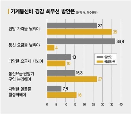 °¡°èÅë½Åºñ¸¦ ÁÙÀ̱â À§ÇÑ ¹æ¾ÈÀ¸·Î £§´Ü¸» ±¸ÀÔ °¡°ÝÀ» Áö±Ýº¸´Ù ´õ ³·Ãç¾ß ÇÑ´Ù£§´Â ÀǰßÀÌ Àüü ´äº¯(º¹¼öÀÀ´ä)ÀÇ 35%¸¦ Â÷ÁöÇß´Ù. Åë½Å»ç ¿ä±Ý°ú ´Ü¸»±â ÇҺαÝÀ» ¹­¾î ³»´Â Áö±ÝÀÇ ±¸Á¶¸¦ °íÃÄ Åë½Å¼­ºñ½º^ÈÞ´ëÆù ºÐ¸® ÆÇ¸Å¸¦ ÇØ¾ß ÇÑ´Ù´Â Àǰߵµ 27%¸¦ Â÷ÁöÇß´Ù. ÀÌ ¹Û¿¡ ¾Ë¶ãÆù Ȱ¼ºÈ­(16%), ´Ù¾çÇÑ °¡°Ý´ëÀÇ Åë½Å ¿ä±ÝÁ¦(10%), Åë½Å»ç ¿ä±Ý¼öÁØÀÇ ÀÎÇÏ(5%) µîÀÌ Á¦½ÃµÆ´Ù.