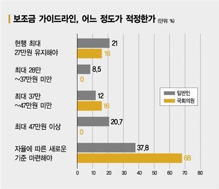 ½º¸¶Æ®Æù ½Ã´ë¿¡´Â »õ·Î¿î º¸Á¶±Ý °¡À̵å¶óÀÎÀÌ ÇÊ¿äÇÏ´Ù´Â Àǰߵµ Áö¹èÀûÀ̾ú´Ù. ÇöÀç ¹ýÁ¤ Çѵµ¾×ÀÎ 27¸¸¿øÀº 4³â Àü £§ÇÇóÆù£§½ÃÀý ÀÌÅë3»ç ¿µ¾÷º¸°í¼­¸¦ ±âÁØÀ¸·Î ¸¸µé¾îÁø °ÍÀ̾ ´Ü¸» °¡°ÝÀÌ ³ô¾ÆÁø Áö±ÝÀº Çѵµ¾×À» ¿Ã·Á¾ß ÇÑ´Ù´Â ÀǰßÀÌ 41.2%¸¦ Â÷ÁöÇß´Ù. ÀÌ Áß 28¸¸¿ø ÀÌ»ó~37¸¸¿ø ¹Ì¸¸Àº 8.5%, 37¸¸¿ø ÀÌ»ó~47¸¸¿ø ¹Ì¸¸ 12%, 47¸¸¿ø ÀÌ»óÀº 20.7%¸¦ ±â·ÏÇß´Ù. °¡À̵å¶óÀÎÀ» ¾ø¾Ö°í ½ÃÀå ÀÚÀ²¿¡ ¸Ã°Ü¾ß ÇÑ´Ù´Â Àǰߵµ 37.8%¿¡ ´ÞÇß´Ù. ÇöÇà´ë·Î À¯ÁöÇØ¾ß ÇÑ´Ù´Â ´äº¯Àº 21%¿¡ ±×ÃÆ´Ù.