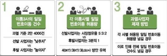 ÇöÀç ÀÌÅë3»ç°£ ³íÀǵǴ ¾È Áß Çϳª´Â ÇÏ·ç ¹øÈ£À̵¿°Ç¼ö°¡ ÀÌÆ² ¿¬¼Ó 2¸¸7000°ÇÀ» ³Ñ°Å³ª ÇÏ·ç¿¡ 3¸¸°ÇÀ» ³Ñ±â¸é ´ÙÀ½ ³¯ºÎÅÍ 5ÀÏ µ¿¾È ÇÏ·ç ¹øÈ£À̵¿ °Ç¼ö°¡ 2¸¸7000°ÇÀ» ³ÑÁö ¸øÇϵµ·Ï Á¦ÇÑÇÑ´Ù´Â °ÍÀÌ´Ù. KT¿Í LGÀ¯Ç÷¯½º´Â ±àÁ¤ÀûÀÎ ¹Ý¸é SKÅÚ·¹ÄÞÀº ºÎÁ¤ÀûÀÌ´Ù.