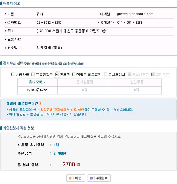 1. »óǰ±¸¸Å ÆäÀÌÁö¿¡¼ °áÁ¦¼ö´ÜÀ» [ÇÚµåÆù]À¸·Î ¼±ÅÃÇÑ ÈÄ [ÁÖ¹®¿Ï·á] ¹öưÀ» Ŭ¸¯ÇÕ´Ï´Ù.